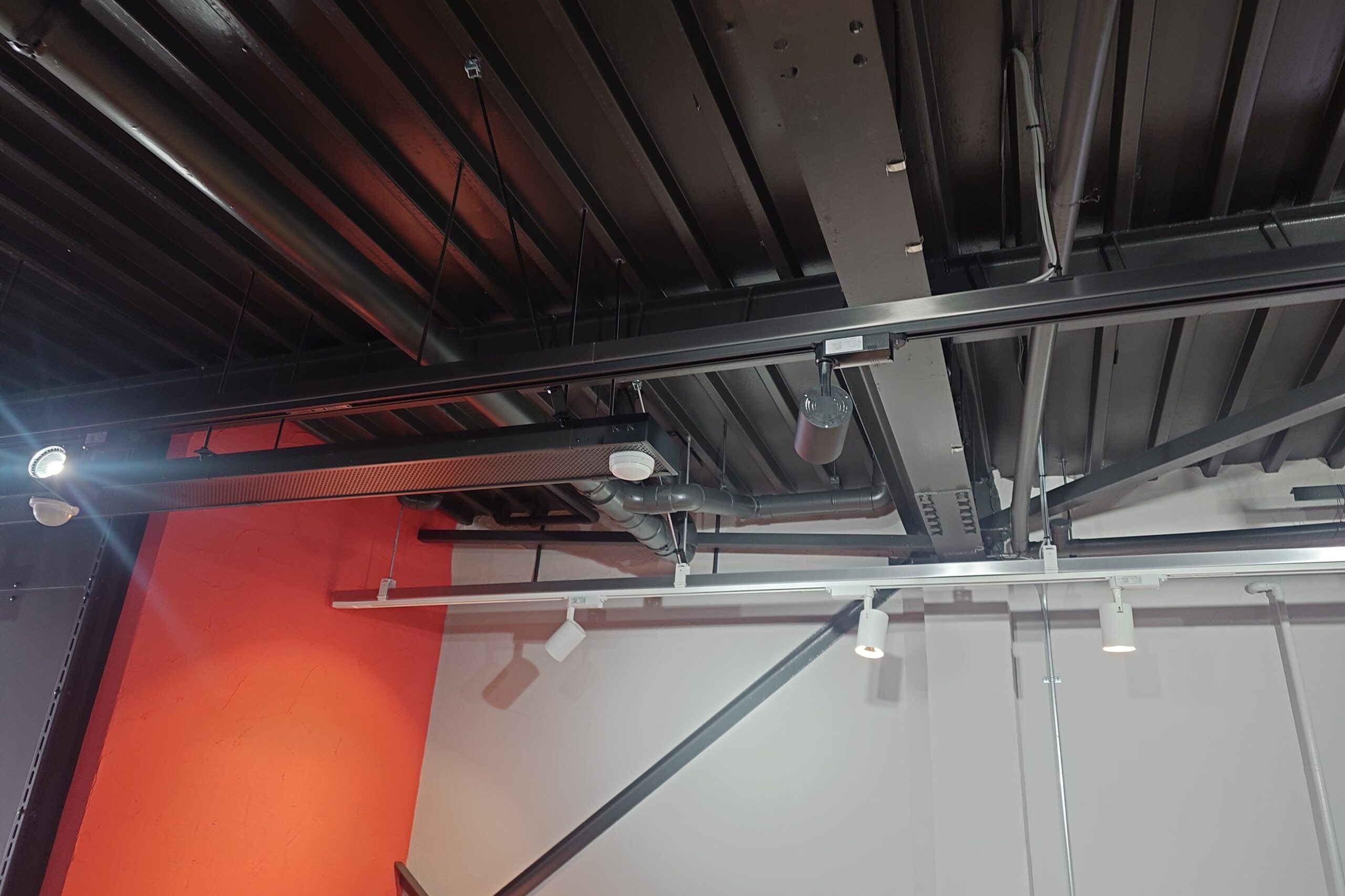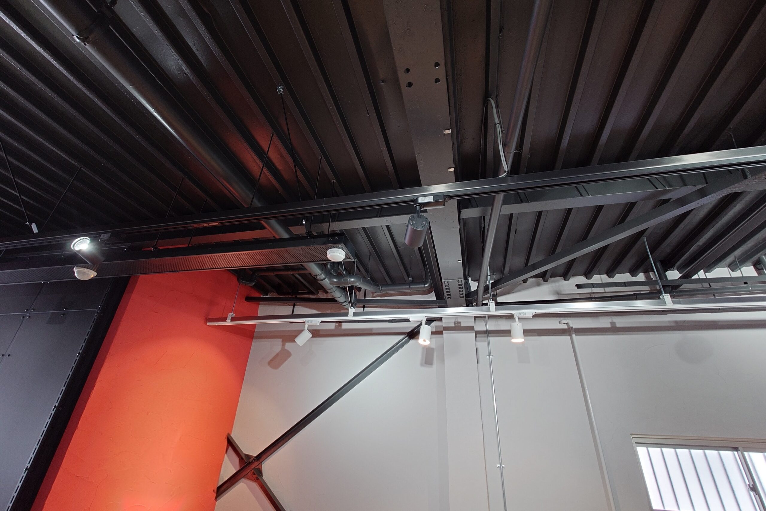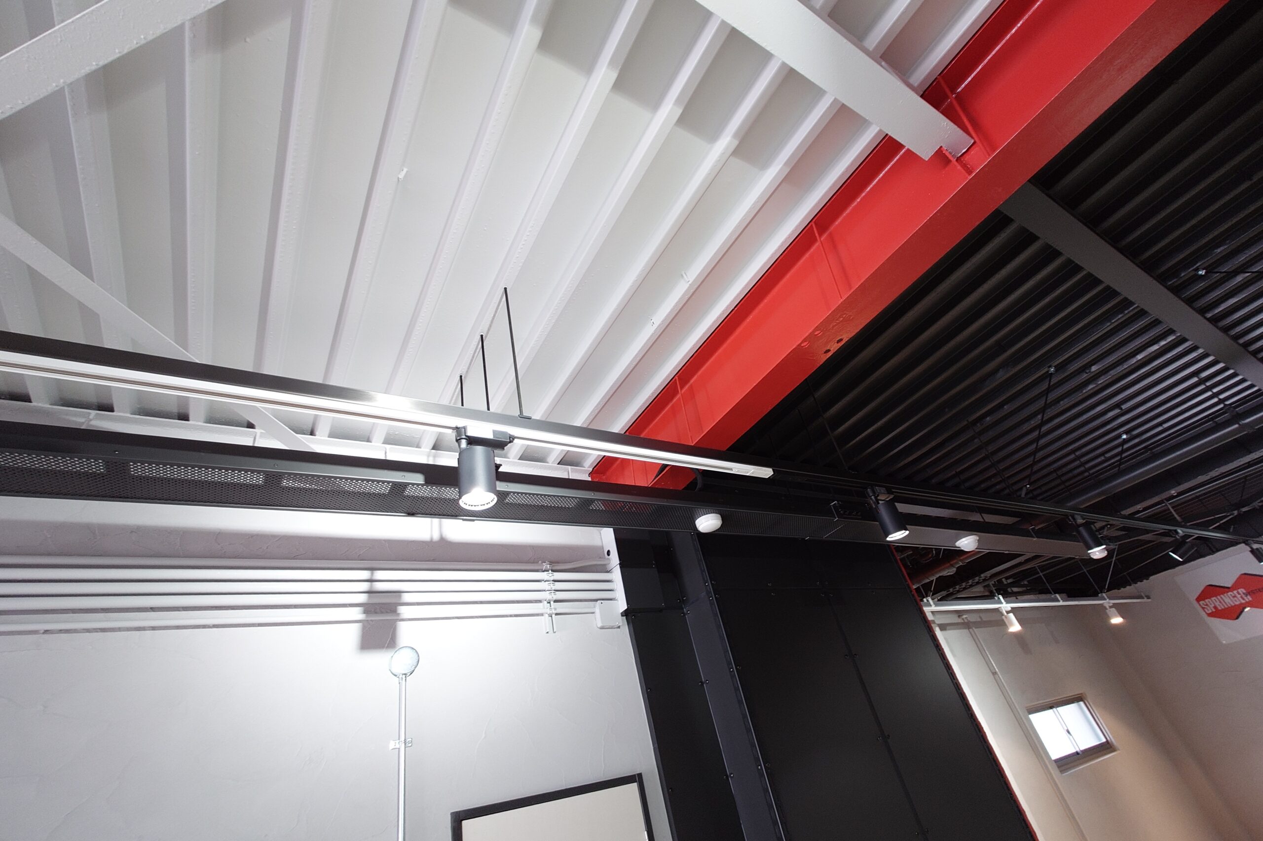 入口より半分は白色スケルトン天井、奥半分は黒色スケルトン天井です。