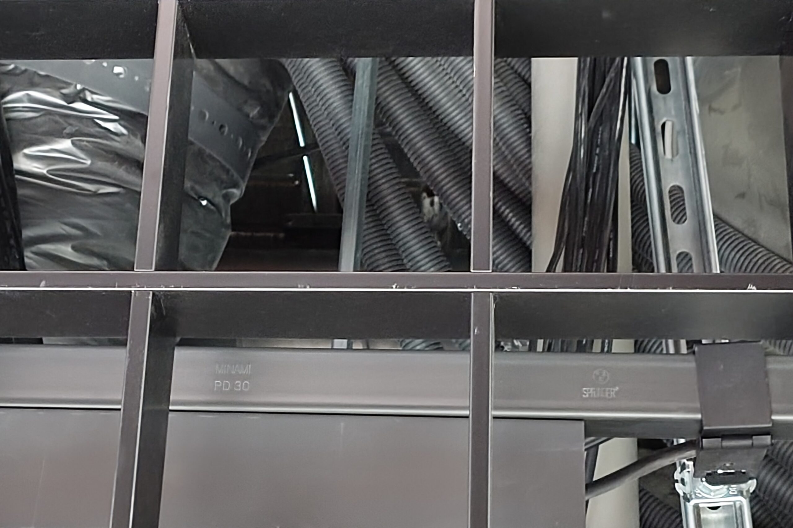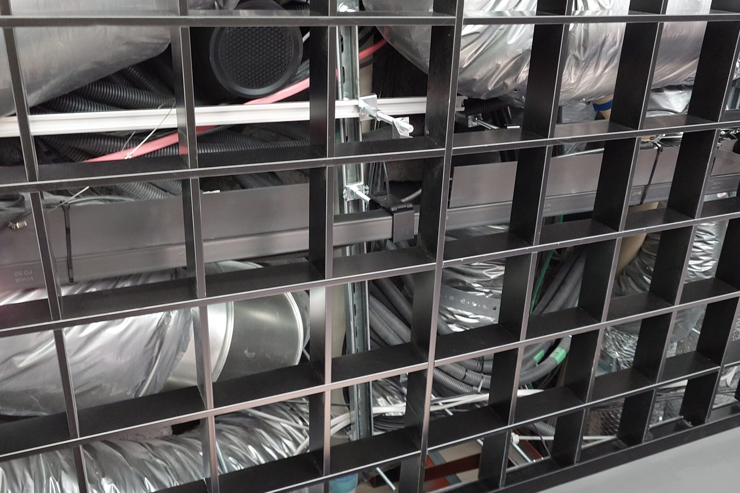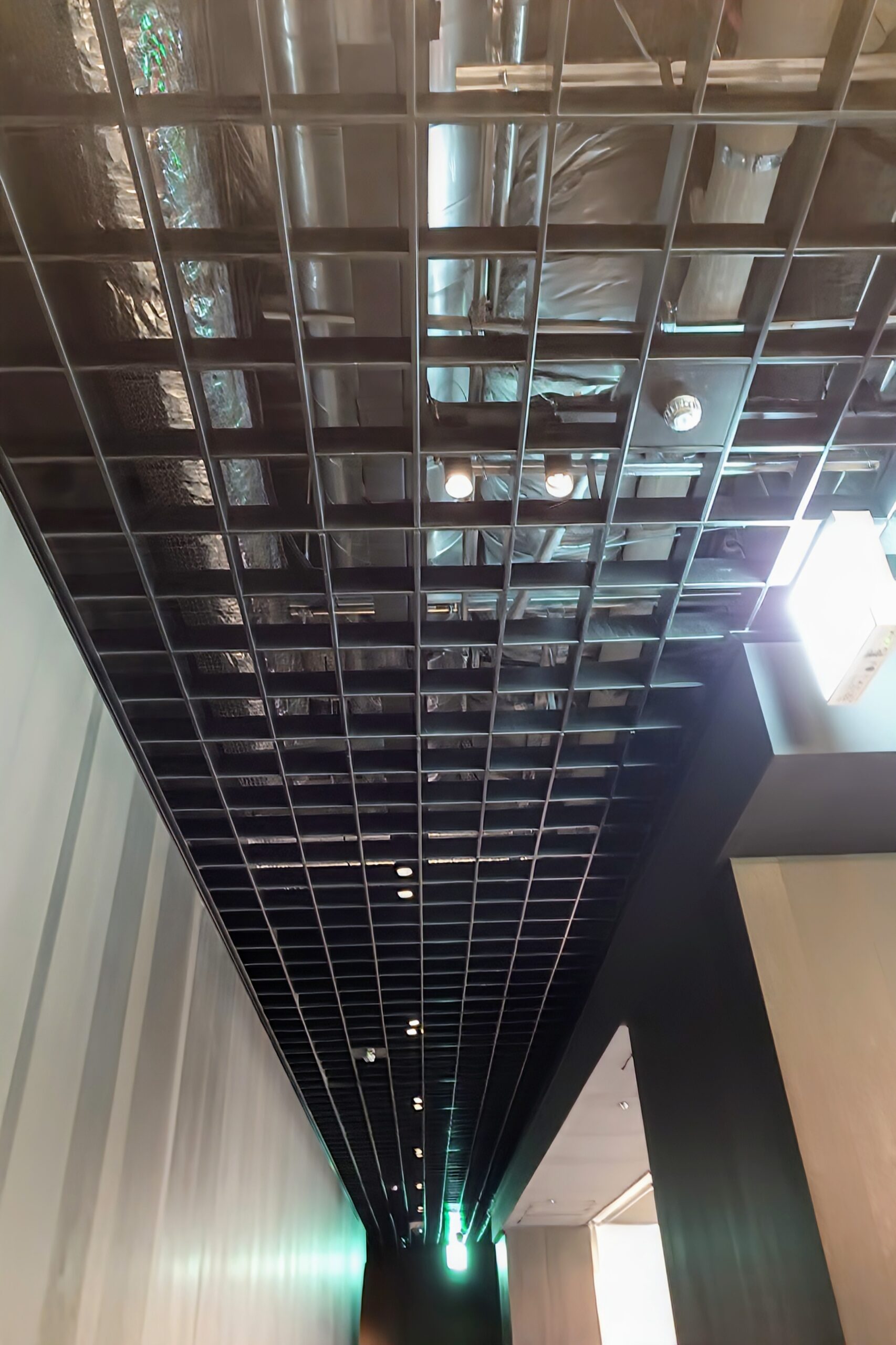 2階エントランス、グリッド(格子)天井内に、環境に優しいデザイニングメタル「黒ZAM®」製レースウェイ「クロウェイ™」ご採用。