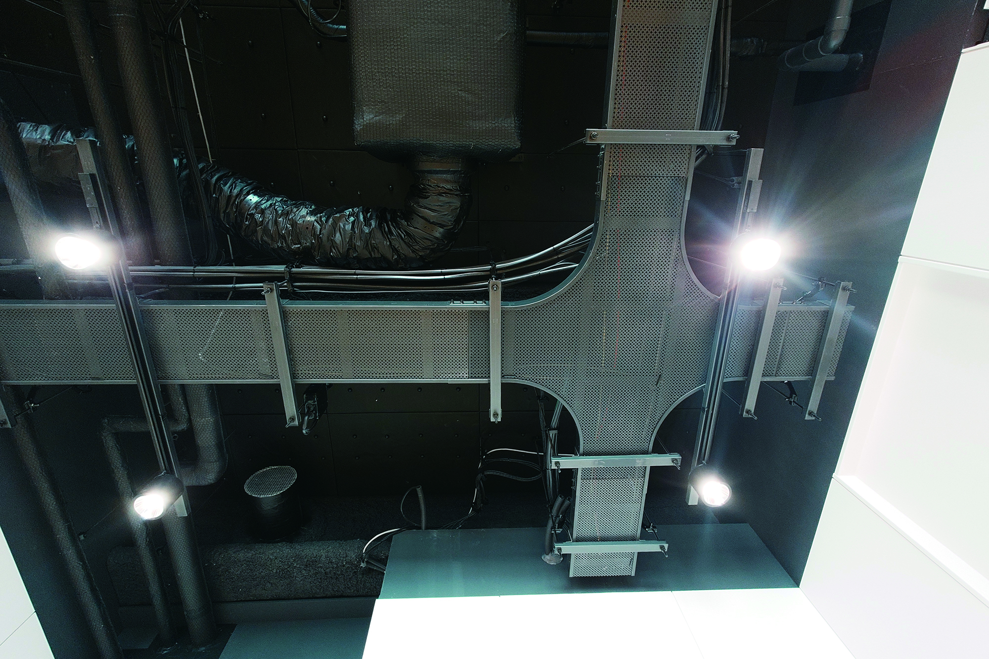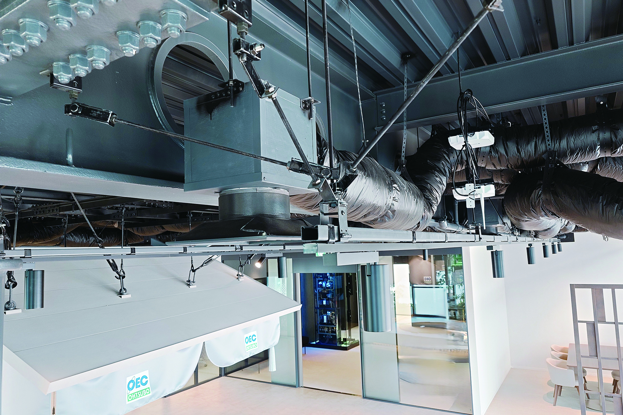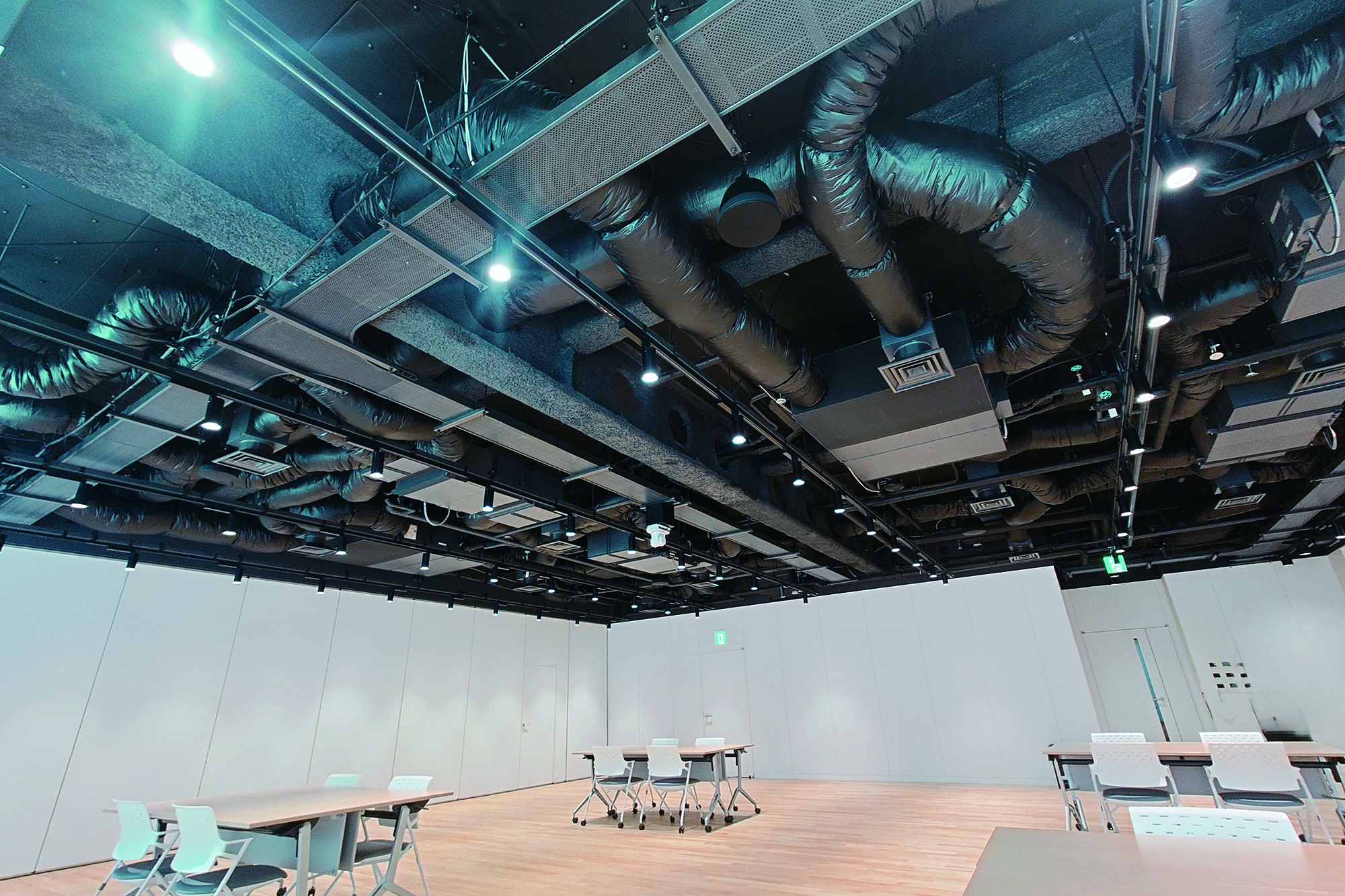また、オフィス階の黒色スケルトン天井に黒ZAM®製ケーブルラック「アーバンラック™」とレースウェイ「クロウェイ™」をご採用され、施工技術の高さはもちろん、アート性・環境性にも配慮された素晴しい空間演出を実現されています。