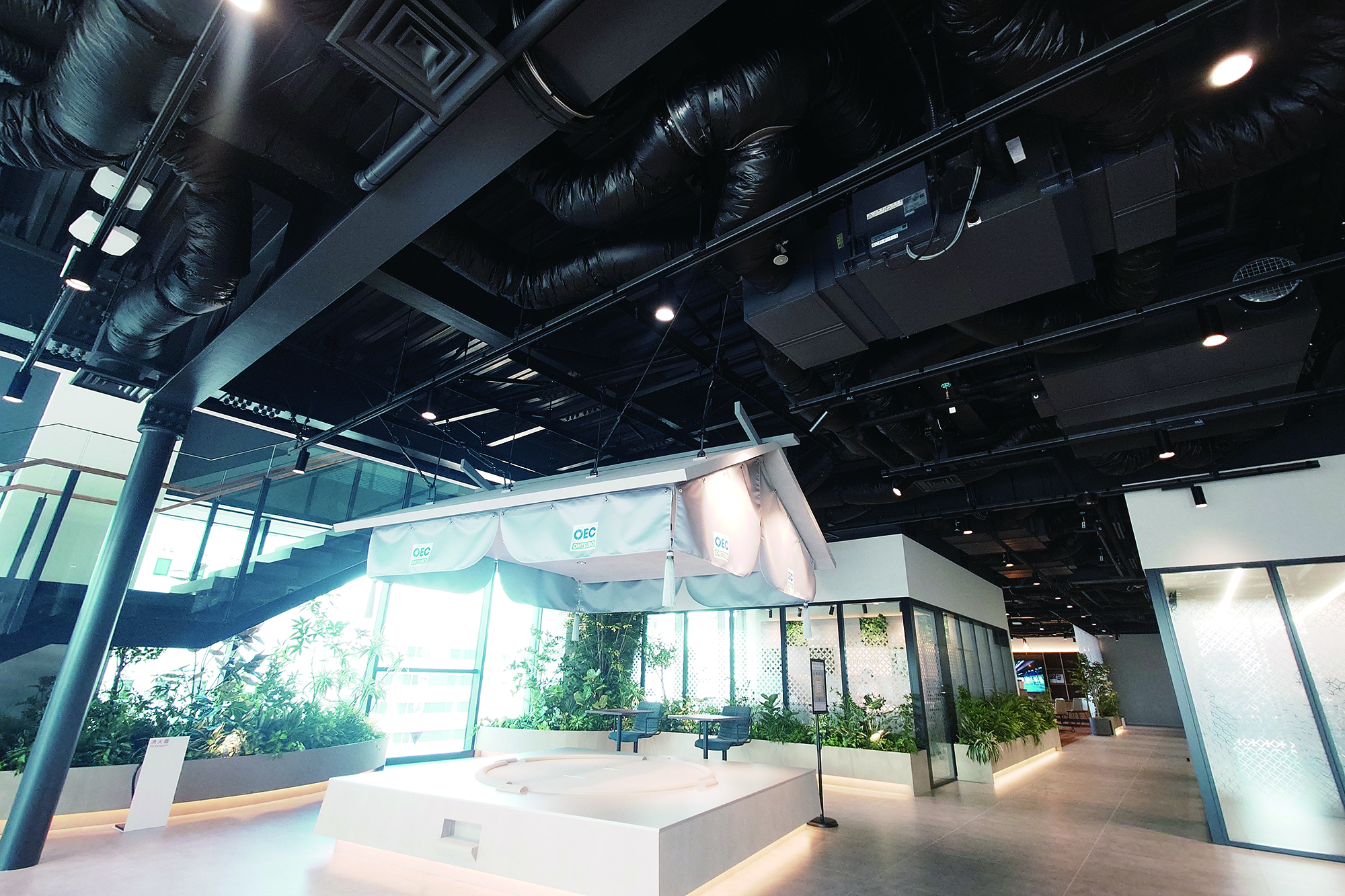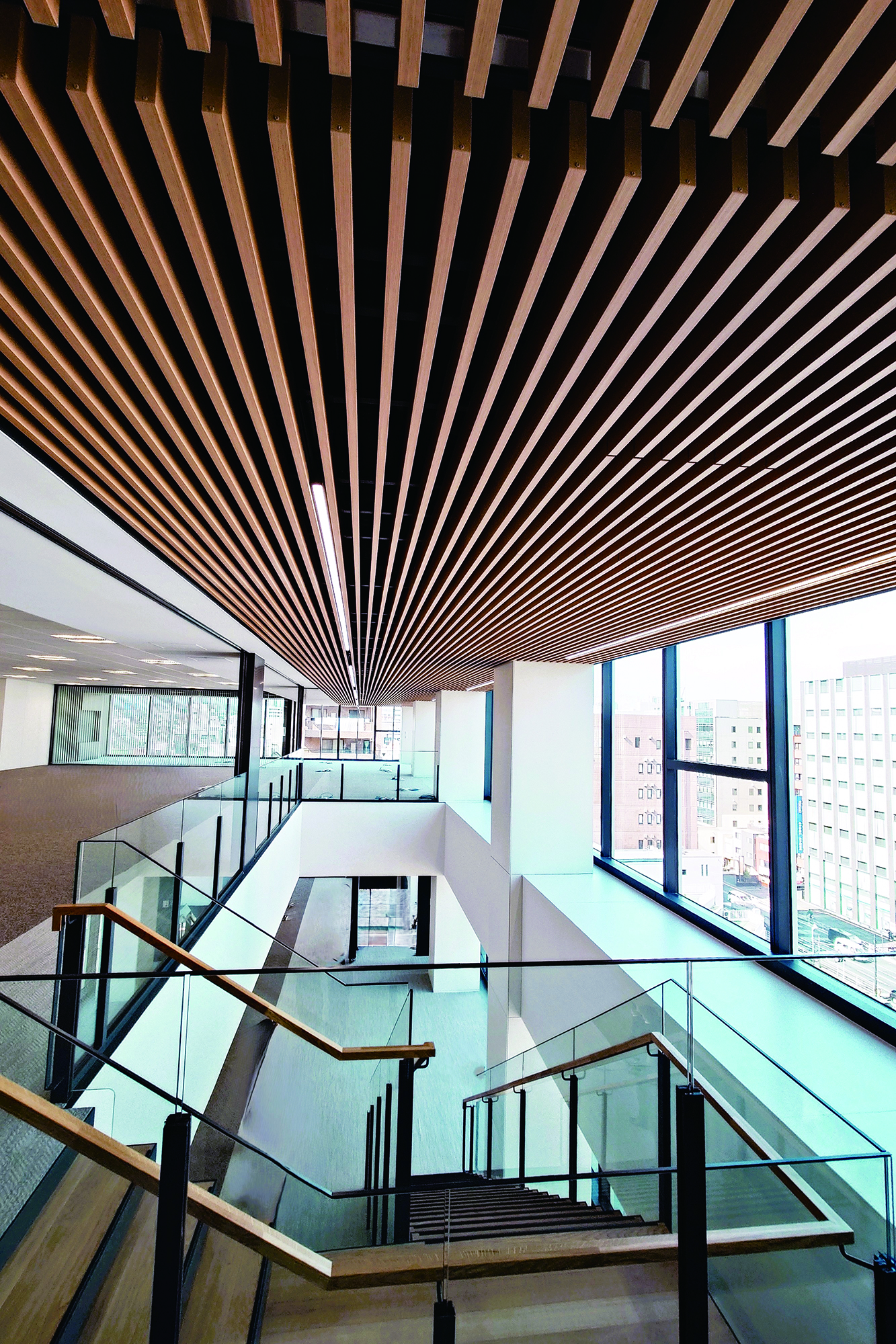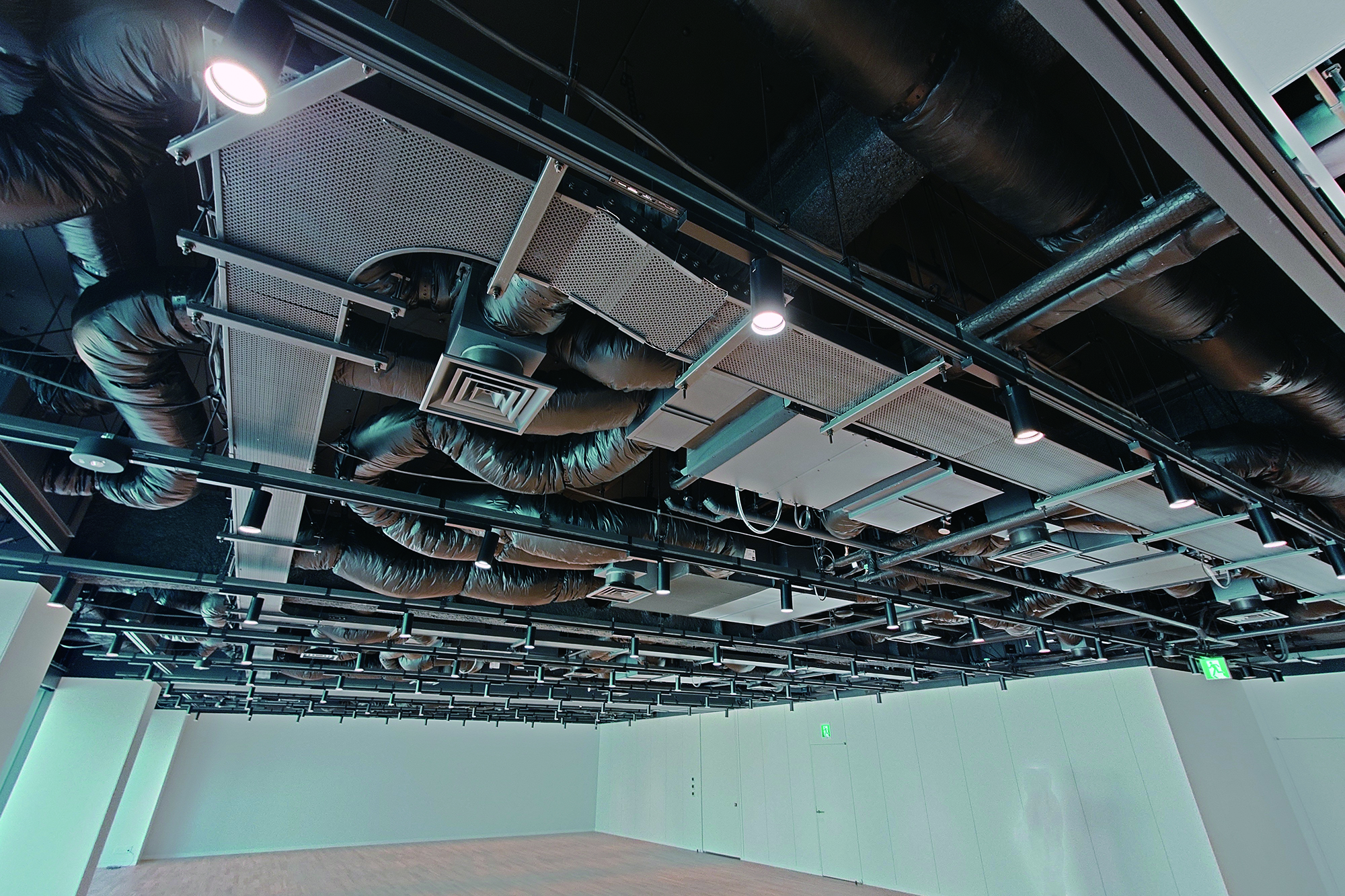 また、オフィス階の黒色スケルトン天井に黒ZAM®製ケーブルラック「アーバンラック™」とレースウェイ「クロウェイ™」をご採用され、施工技術の高さはもちろん、アート性・環境性にも配慮された素晴しい空間演出を実現されています。